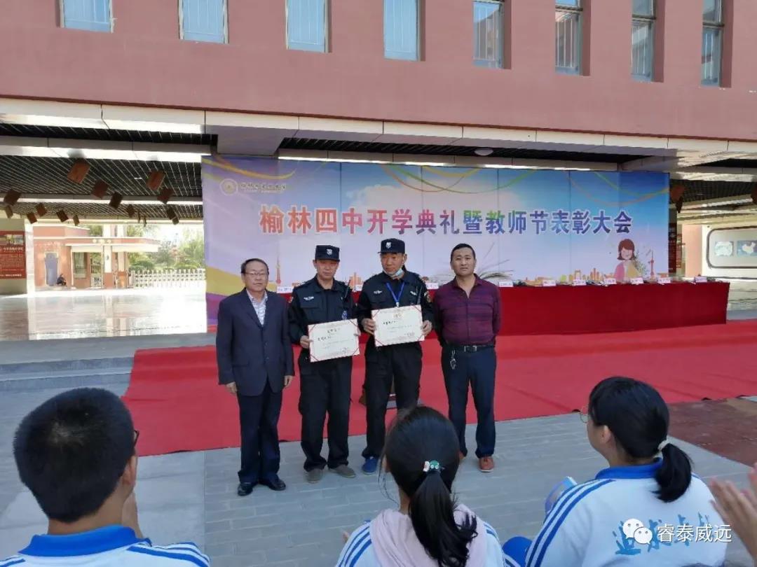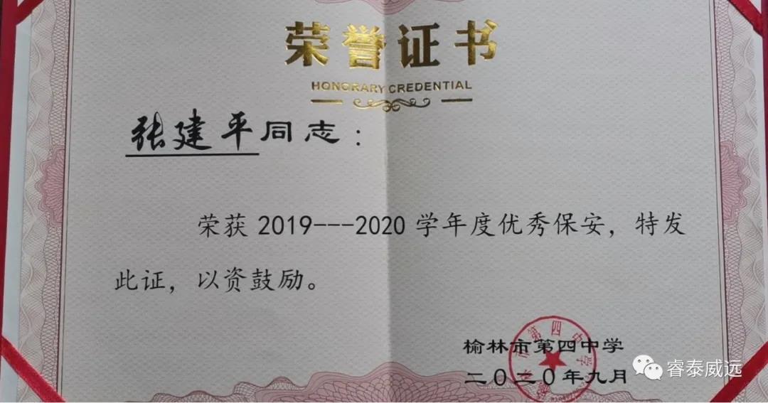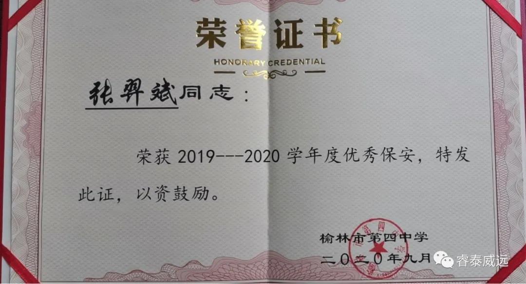 公司新聞近日,榆林市第四中學(xué)舉辦教師節(jié)表彰大會(huì),威遠(yuǎn)安保集團(tuán)駐四中校園保安員張羿斌、張建平同志榮獲“2019-2020學(xué)年度優(yōu)秀保安”稱號(hào),并獲得校領(lǐng)導(dǎo)頒發(fā)的榮譽(yù)證書(shū)。