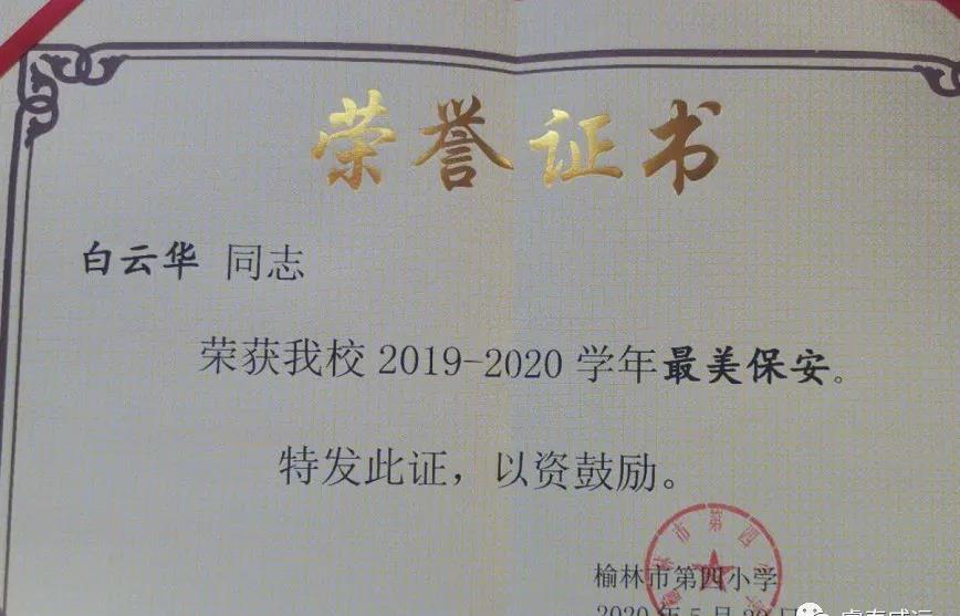 在榆林市第四小學(xué)舉辦的表彰大會(huì)上,公司駐一大隊(duì)二中隊(duì)校員保安員白云華同志被學(xué)校評(píng)為2019-2020學(xué)年“最美保安”。