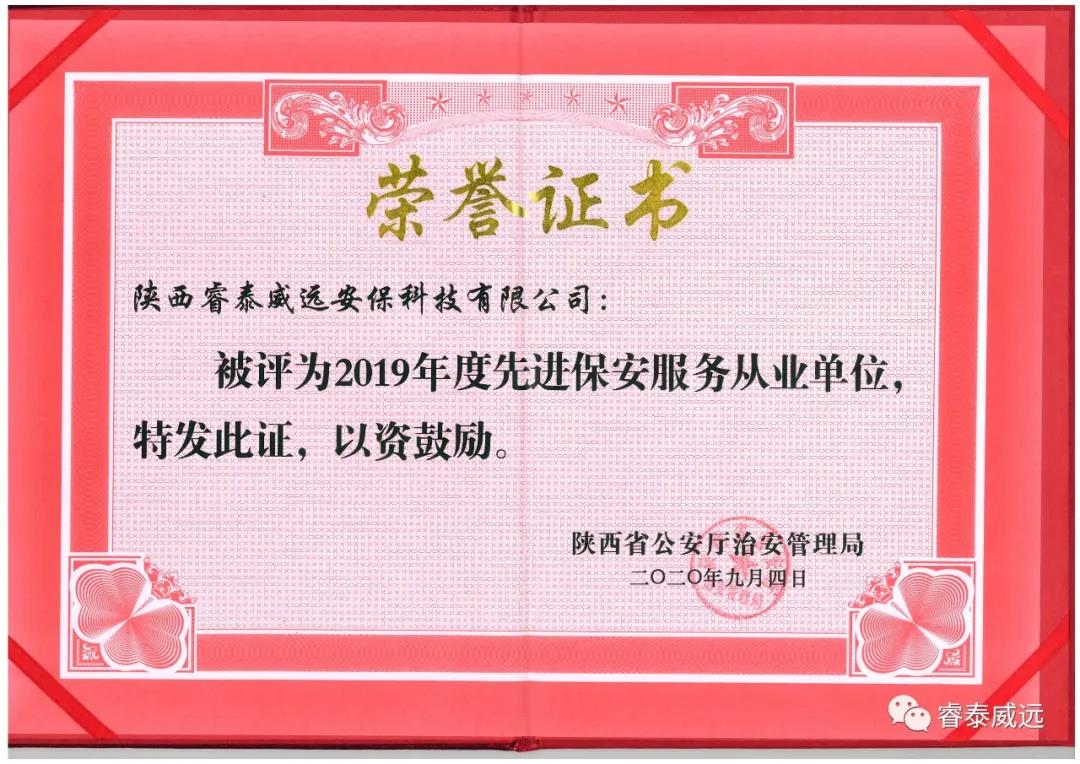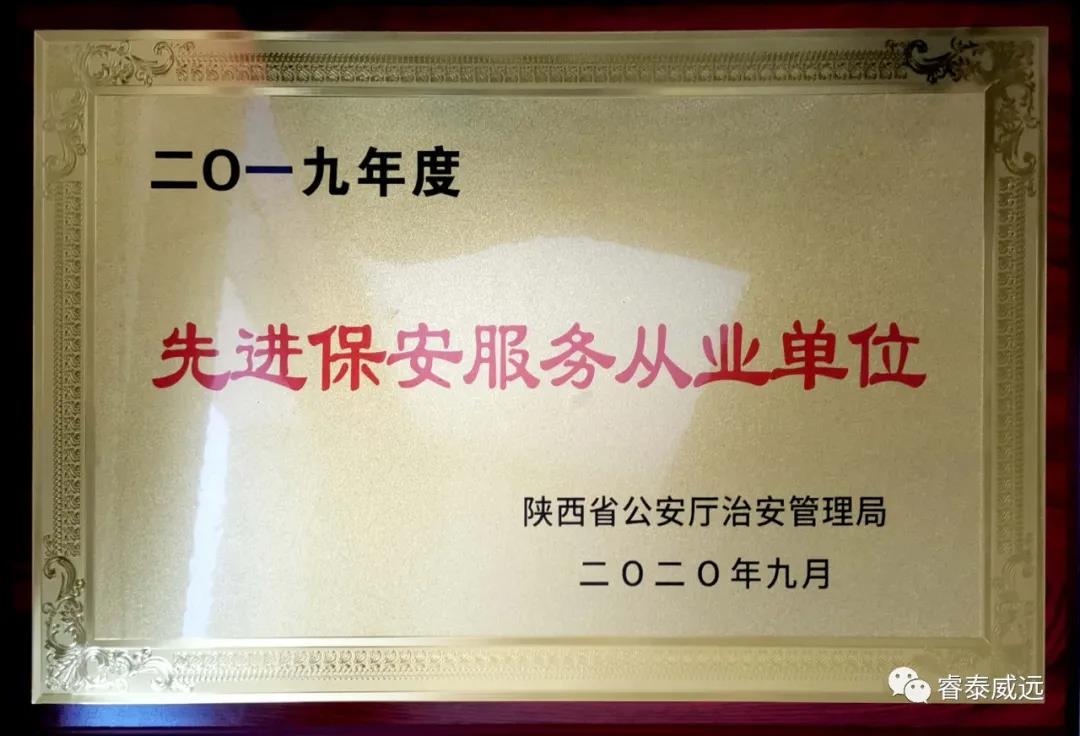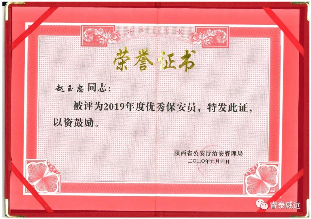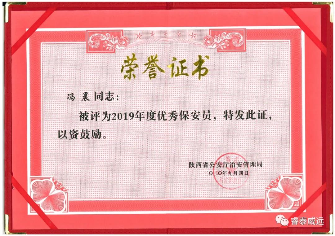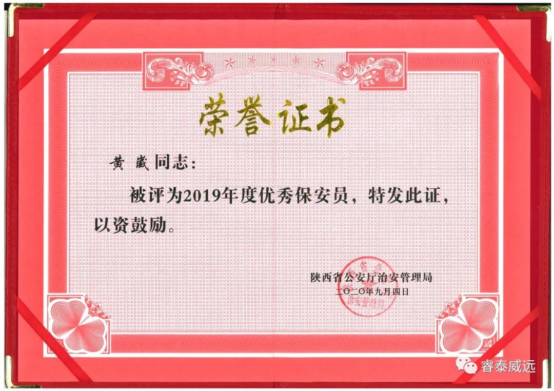 陜西睿泰威遠安保科技有限公司榮獲“2019年度先進保安服務(wù)從業(yè)單位”稱號;公司總經(jīng)理黃崴、人防事業(yè)部大隊長趙玉忠、馮晨被評為全省優(yōu)秀保安員。