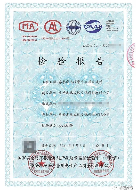 公司新聞 2021年2月5日,陜西威遠安保科技集團“110報警聯(lián)網(wǎng)中心”通過了“國家安全防范系統(tǒng)產品質量監(jiān)督檢測中心”和“公安部安全與警用電子產品質量檢測中心”檢測并獲得證書。