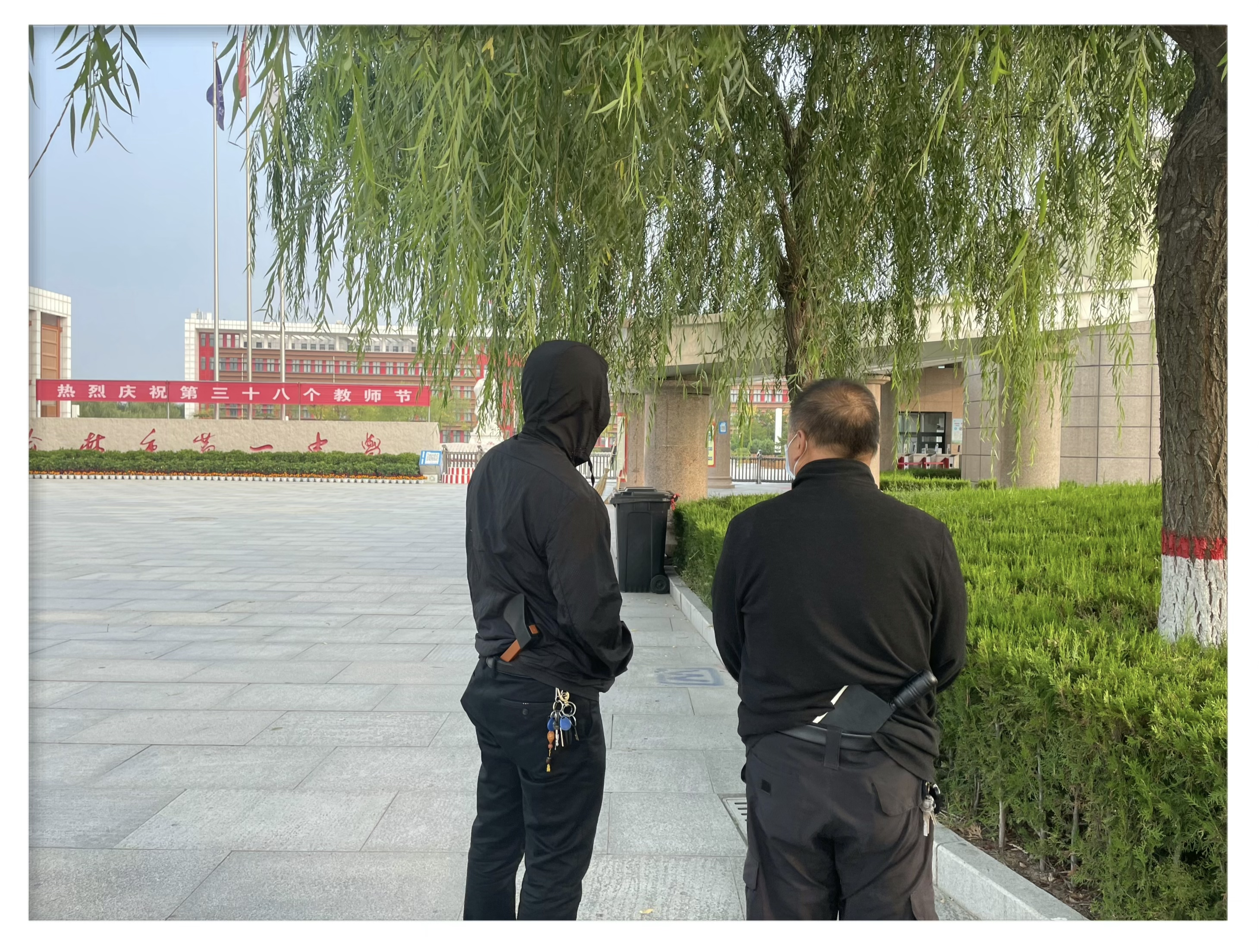 上午8:30,演練正式開始。兩名形跡可疑人員(由我集團項目隊長扮演)在校園周邊徘徊,并慢慢走向校門口。