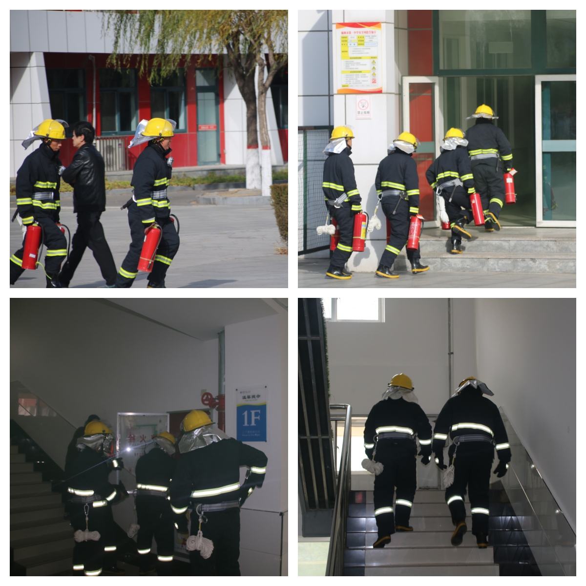 學校消防自救隊員身著防火服,攜帶滅火器迅速沖向“火點”;